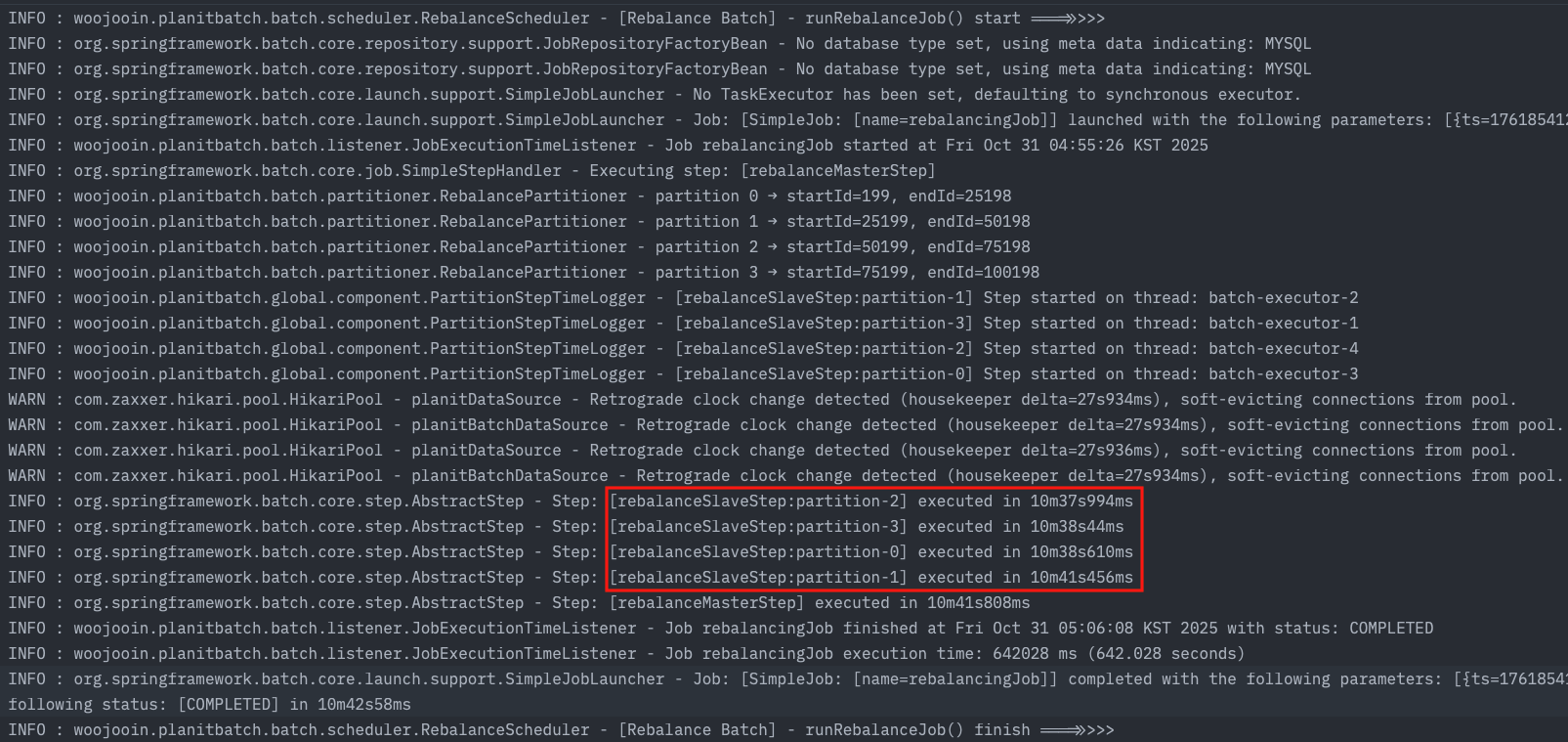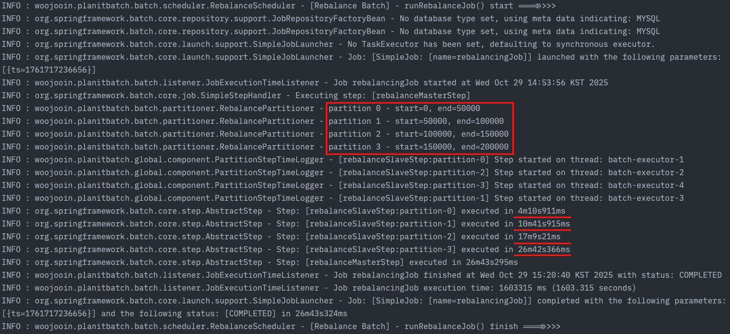 로그를 보면 파티션별로 시작시간과 작업 크기는 동일했지만 작업 진행 시간이 크게 차이나는 것을 볼 수 있습니다.