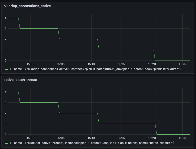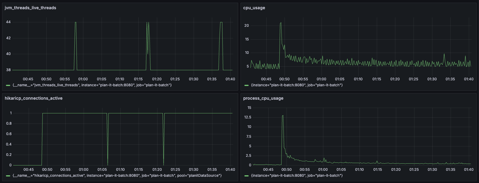 hikari_connections_active를 보면 DB 커넥션 풀도 1개 밖에 사용하지 않고 있었고, cpu 사용률도 배치 진행중에도 낮은 사용률을 보여주었습니다. 여유로운 리소스를 최대한 활용할 필요가 있음을 느꼈습니다.