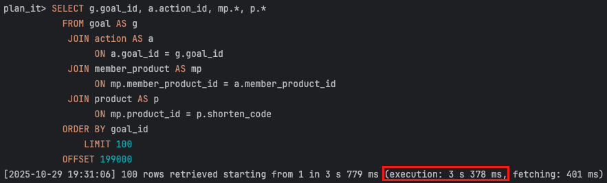 즉, OFFSET이 커질수록 MySQL이 읽고 버려야 할 행(row)의 수가 기하급수적으로 증가합니다.