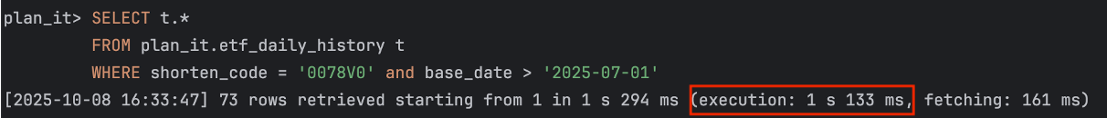 실제 batch에서 etf 매매내역 조회시 사용되는 쿼리의 조회시간이 1sec정도 되는걸 확인했습니다.