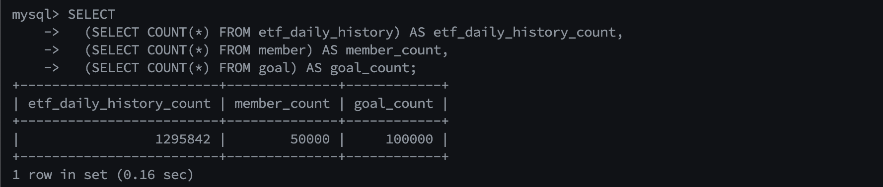 50,000명의 사용자에 대한 목표, 등 모든 목데이터 생성 및 실제 ETF 상품의 일일 매매 정보를 공공데이터에서 주기적으로 저장하여 100만개의 데이터가 MySQL에 적재되어 있었습니다.