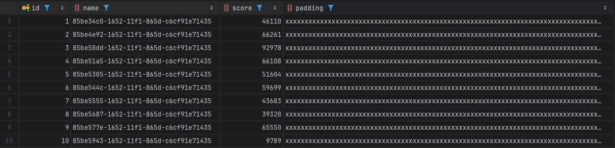 padding VARCHAR(900) -- row 크기 키우기 (1KB)