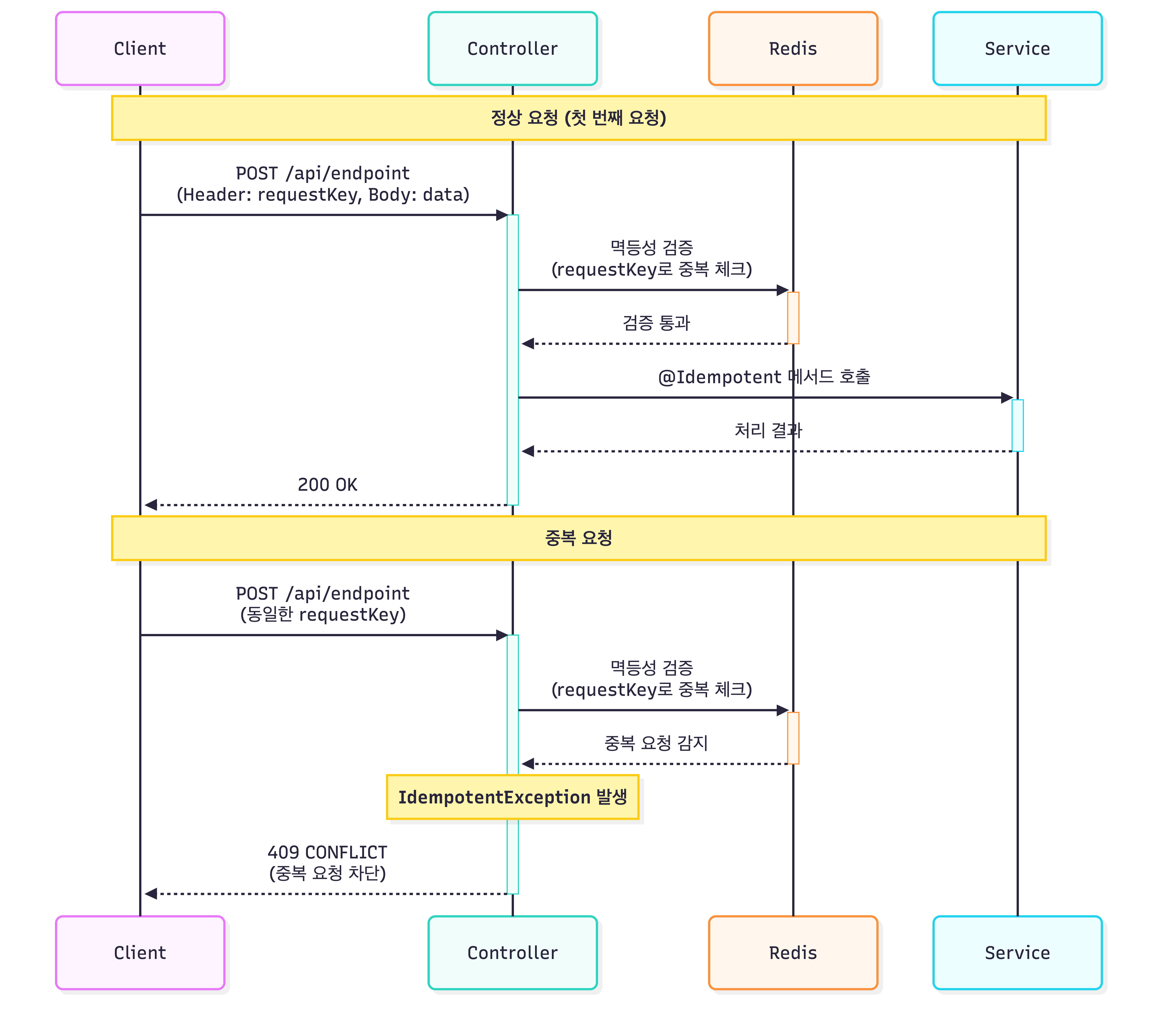 특히 Controller까지는 요청이 도달하지만, Service 실행 직전에 Redis 기반 멱등성 검증이 이루어지기 때문에 포인트 차감과 같은 핵심 로직을 안전하게 보호할 수 있었습니다.