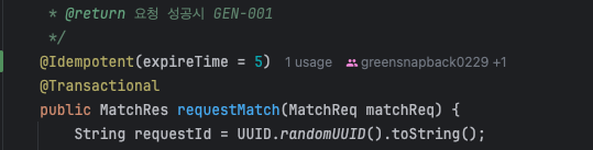 매칭 기능을 담당하는 서비스 레이어 requestMatch 메서드에 Idempotent를 다음과 같이 적용할 수 있었습니다.