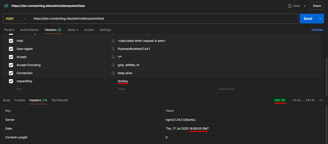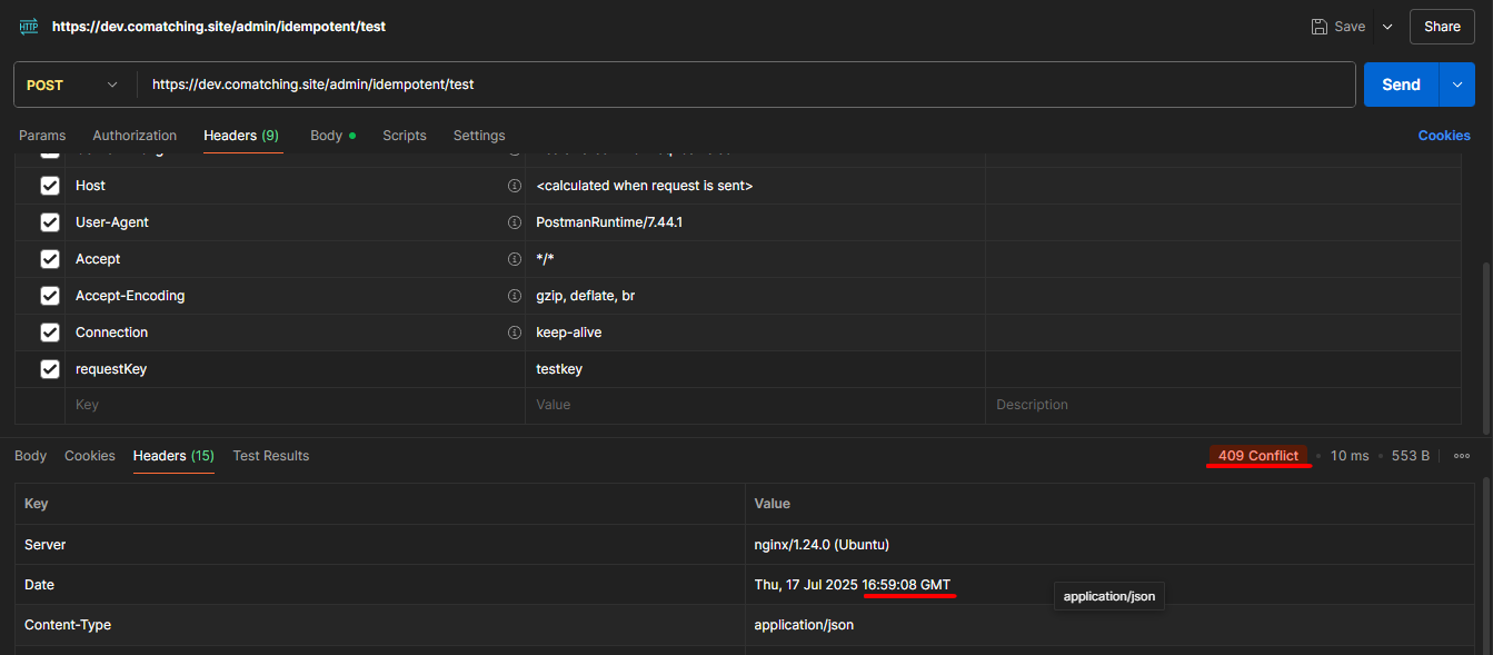 이를 통해 같은 요청이 여러 번 전달되더라도 비즈니스 로직은 단 한 번만 수행됨을 확인할 수 있었습니다.