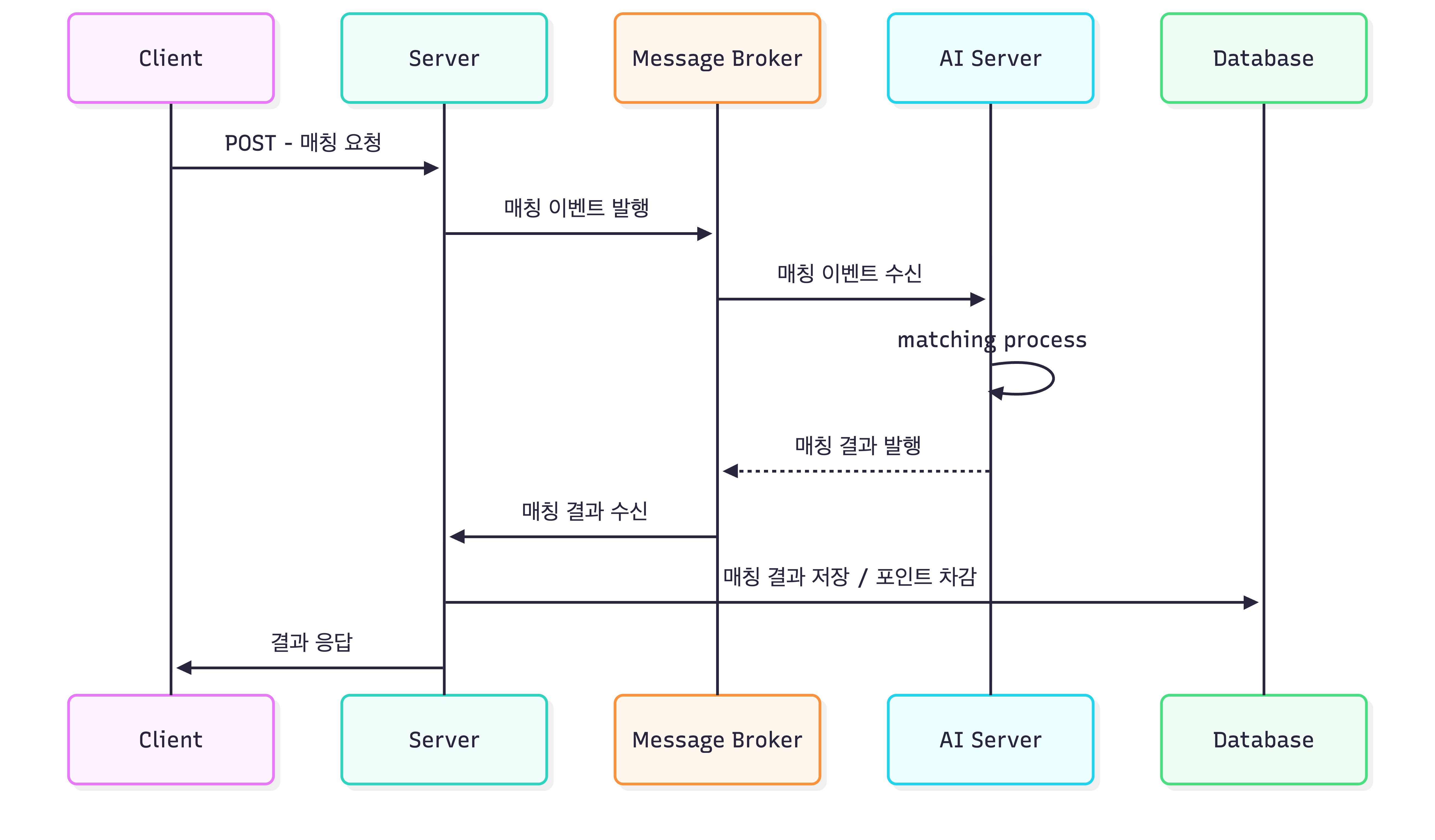 매칭 기능은 HTTP POST 메서드로 호출되고 body에 담긴 매칭 옵션을 기반으로 매칭 결과를 DB에 저장하고 응답하는 과정을 거칩니다.