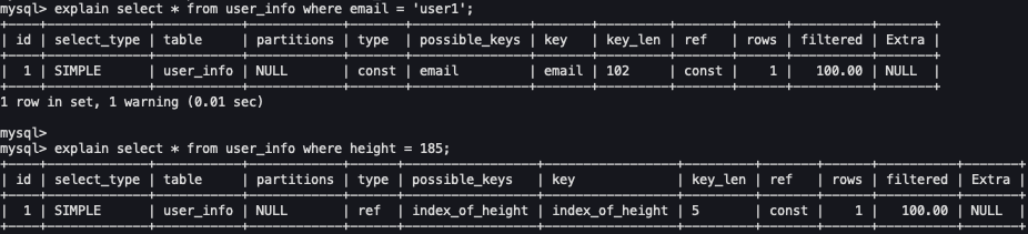email은 const type입니다. unique 제약 조건으로 규칙상 1건 이상 조회될 수 없기 때문에 optimizer가 단일 조회(const)를 한 것입니다.