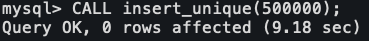 empty table에서 수행했고 insert되는 데이터가 작았기 때문에 다음과 큰 차이가 있진 않았지만 기존에 저장되어 있는 row수가 커질수록 중복 검사시 탐색 비용이 커지므로 더 오랜 시간이 걸릴거라고 예상해볼 수 있습니다.